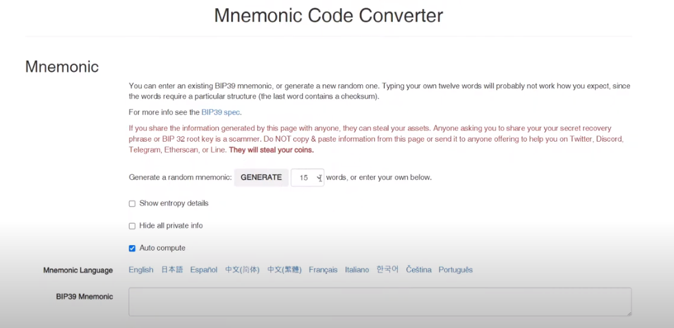 이안콜먼(Ian Coleman) 암호키(니모닉) 생성사이트