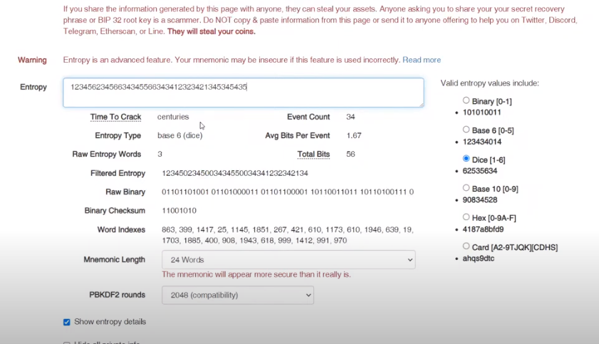 - 참고로, 산출도구 각각의 엔트로피값이 일정수가 오버해도, 니모닉 길이값을 24로 설정했다면, 24개 니모닉 단어는 변함없이 설정이 됨, 즉 엔트로피값이 오버되더하더라도 니모닉 단어가 바뀔 뿐이지 단어24개가 오버되지는 않음.