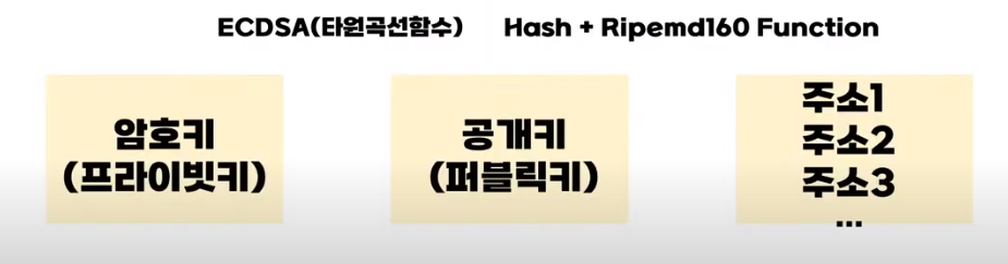 - 암호키(개인키)를 가지고 공개키를 생성할 수 있고, 공개키를 가지고 주소를 생성함(일방향 함수)