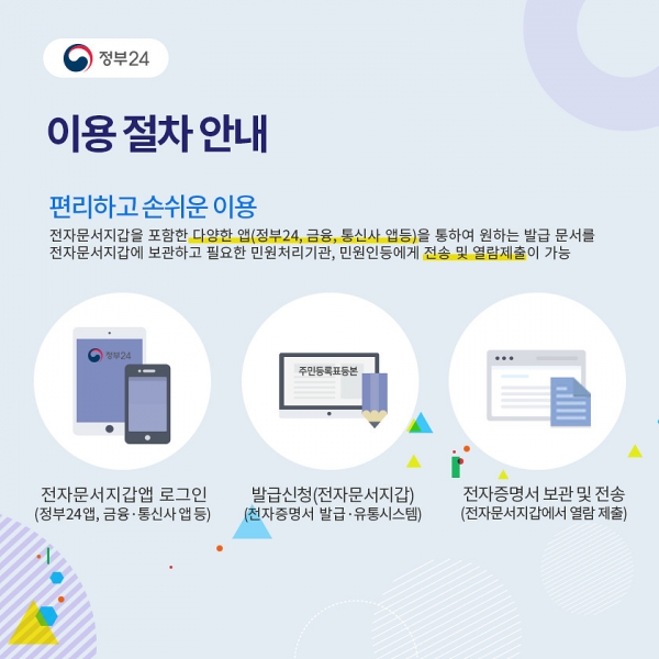 정부24 <전자문서지갑>이란 정부에서 운영하는 전자문서지갑으로서, 정부 및 공공기관 발행 각종 민원서류(예, 우리들이 종종 이용하는 주민등록등초본, 가족관계증명서, 예방접종증명서 중등 성적증명서, 초등 졸업증명서, 각종 납세증명서 등)를 온라인상의 전자증명서 형태로 내 스마트폰 나의 <전자문서지갑>에 받아볼 수 있는 시스템을 말합니다.
